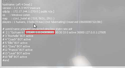 打开游戏随便创建一个本地服务器大厅然后开始游戏(一个人即可)然后打开控制台输入status就可以看到当前玩家姓名和Steam id