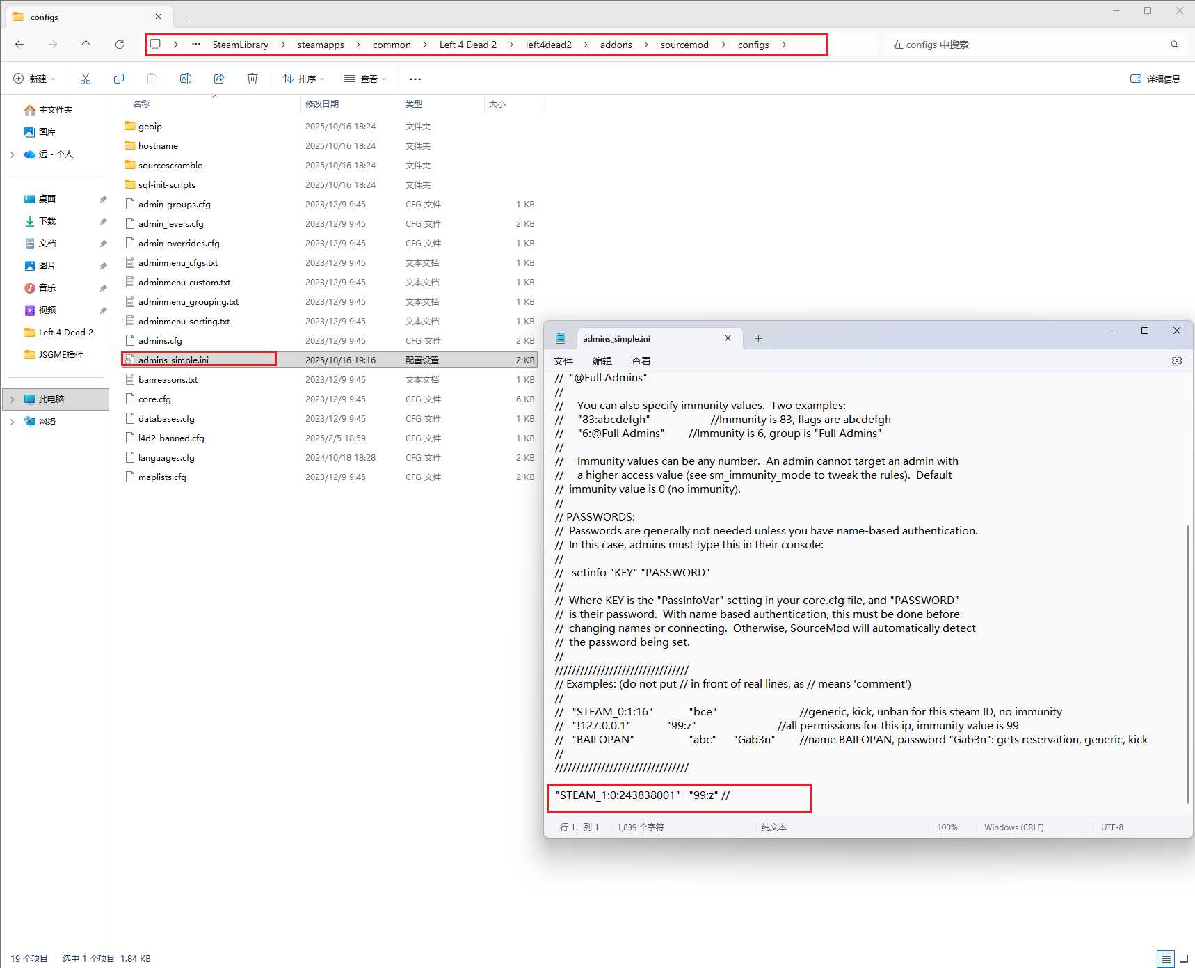复制你自己的steam id然后打开Left 4 Dead 2\left4dead2\addons\sourcemod\configs目录下的admins_simple.ini在最下面添加你的steam id
